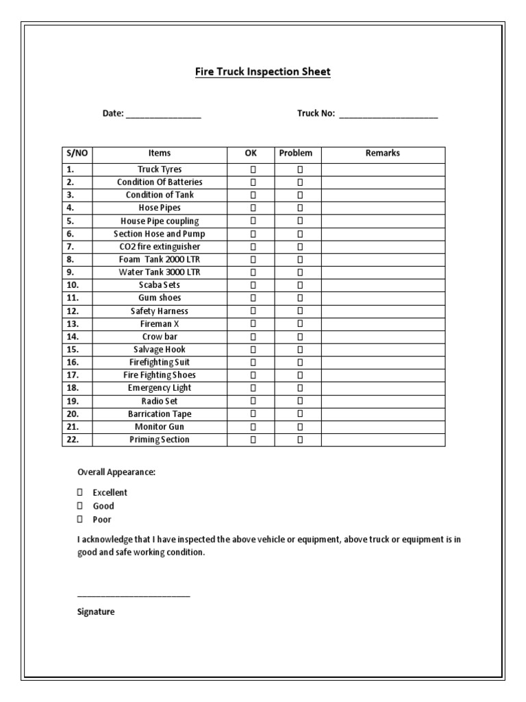 Printable Fire Apparatus Inspection Checklist